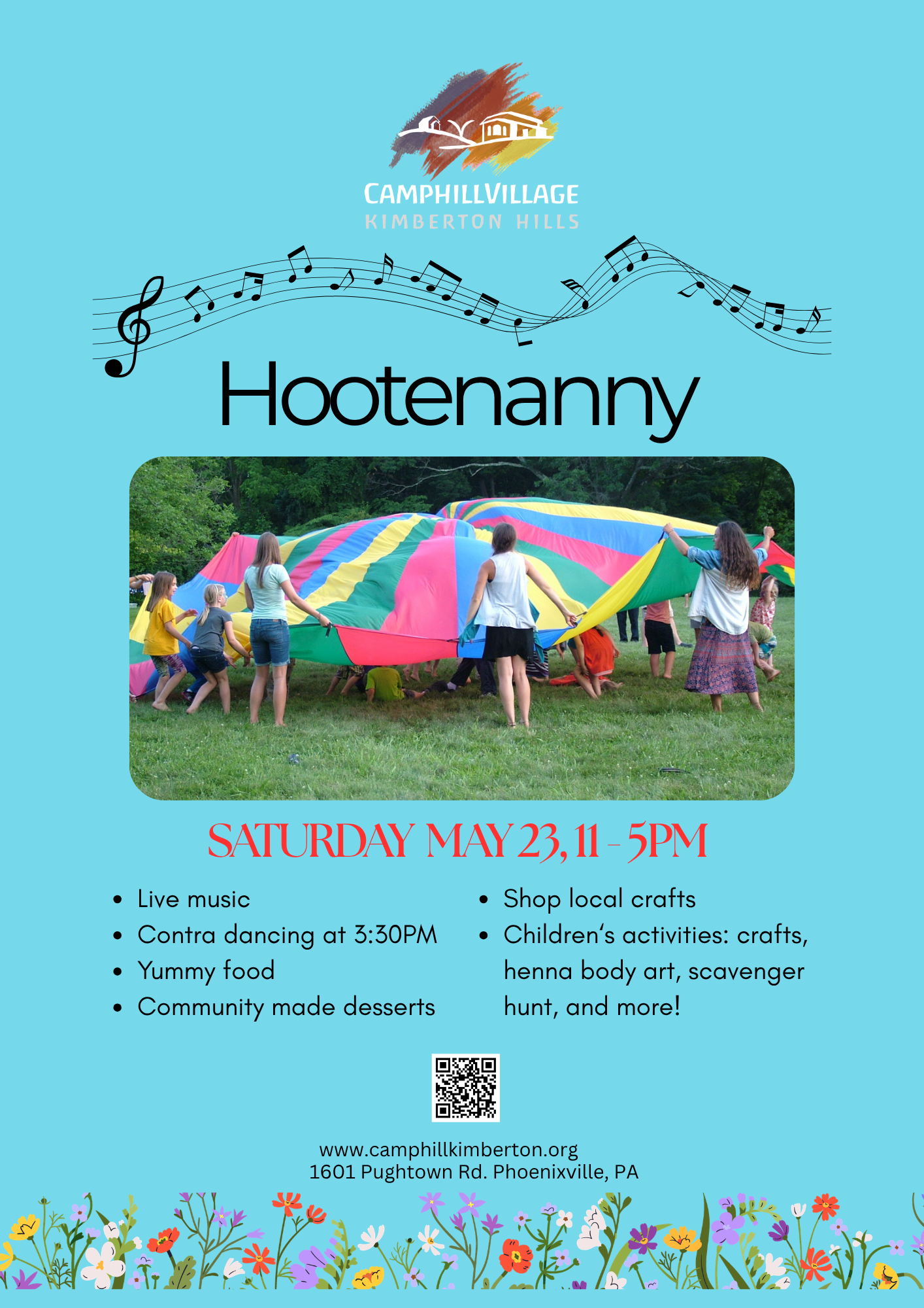 Hootenanny - May 23 Saturday, May 23, 2026 11:00 AM 5:00 PM Camphill Village Kimberton Hills 1601 Pughtown Road Phoenixville, PA, 19460 United States (map) Google Calendar ICS The beloved Camphill Hootenanny is back! Join us for live music, dancing, great food, and children’s activities. PLUS, contra dancing starts at 3:30 pm.