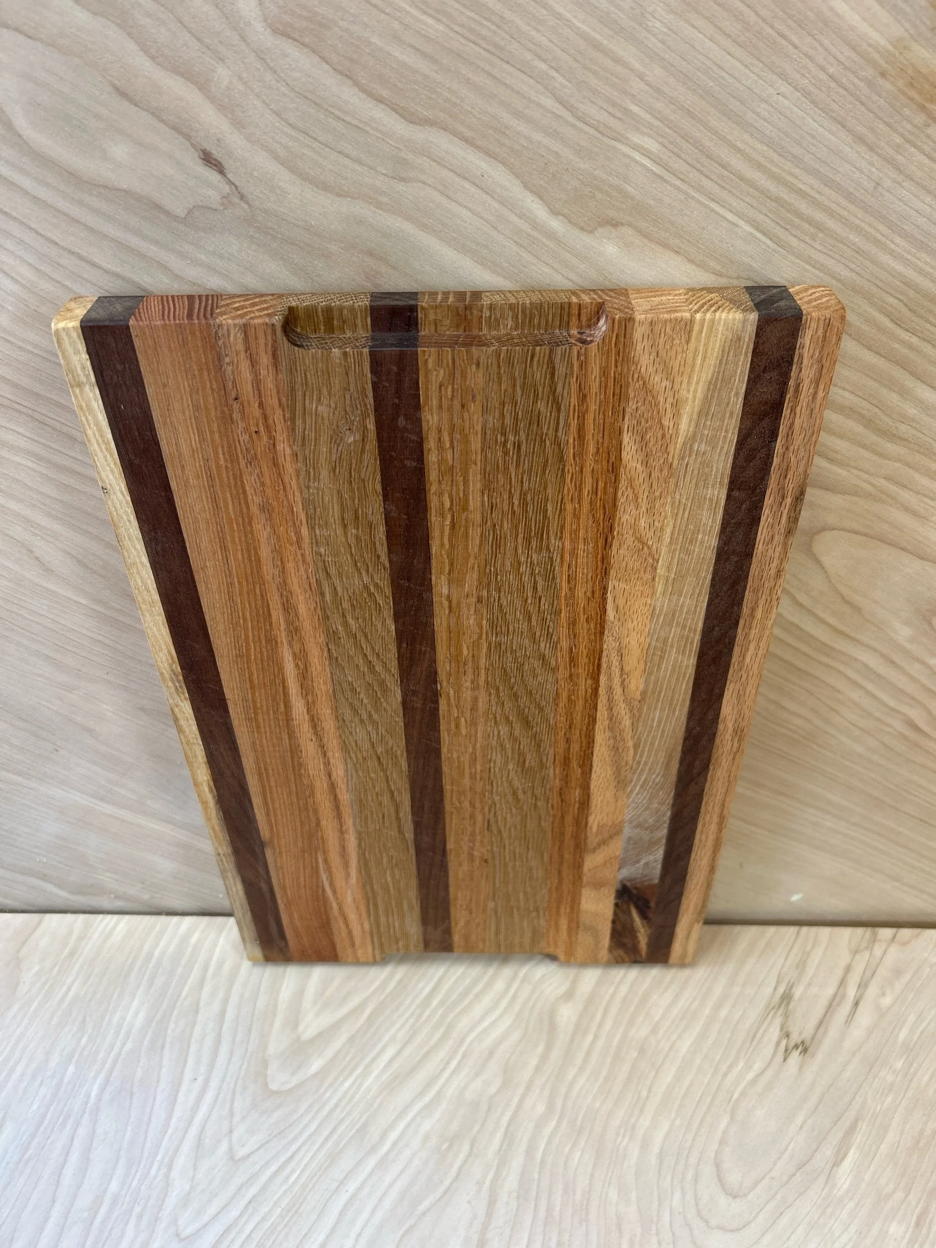 This cutting board is made from Walnut, Oak and Maple. The wood used was grown and processed in Kimberton Hills. This cutting board is hand crafted and very solid it will be a pleasure to use.